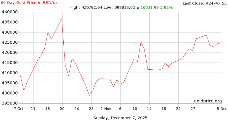 If you are looking to buy gold in Serbia, you will see prices quoted in the local currency, the Serbian Dinar. Prices may also be available in other global currencies as well, such as euros, U.S. Dollars, Japanese Yen or Great British Pounds. Gold is typically quoted by the ounce, gram or kilo, and may also be quoted in other local units of measure.